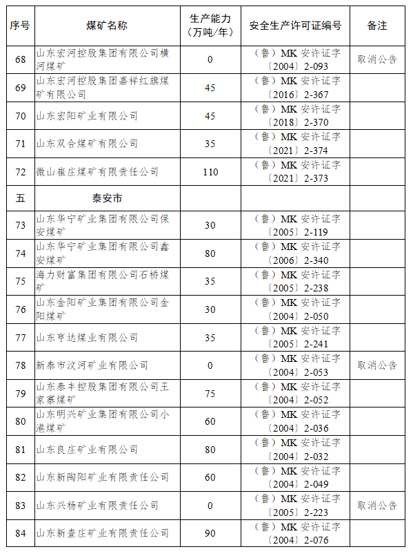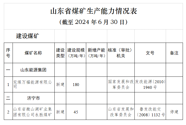 截至2024年6月30日,山东省有依法生产建设煤矿84处,产能规模12163万吨/年。其中,建设煤矿2处,建设规模225万吨/年;生产煤矿82处,登记生产能力11938万吨/年。