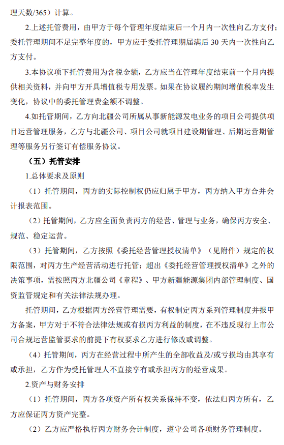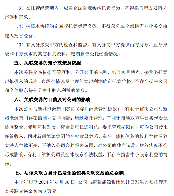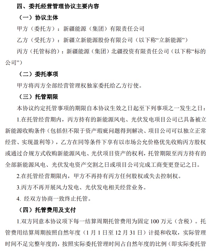 据悉,7月25日,立新能源公告称,为避免新疆能源集团与立新能源构成实质性同业竞争,新疆能源集团拟将合计装机3.05gw的8个新能源项目划转到目注入其全资子公司北疆公司,并将北疆公司委托给立新能源经营管理。托管费用为每年固定100万元(含税)。