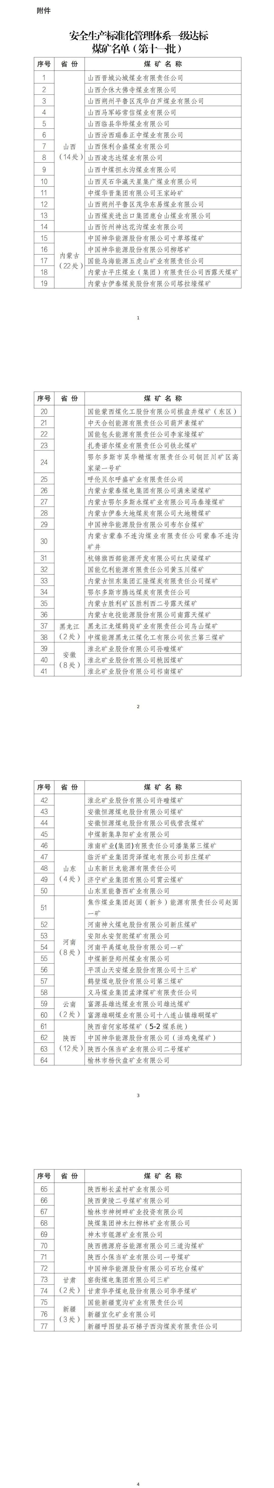 7月31日,国家矿山安全监察局发布《关于公布安全生产标准化管理体系一级达标煤矿名单(第十一批)的通知》。经资料审查、现场检查抽查、网上公示,确认山西晋城沁城煤业有限责任公司等77处煤矿(详见附件)为安全生产标准化管理体系一级达标煤矿,现予以公布。