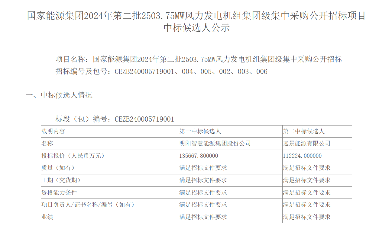 公告显示,第一中标候选人:明阳智慧能源集团股份公司,投标报价:135667.800000万元。第二中标候选人:远景能源有限公司,投标报价:112224.000000万元。