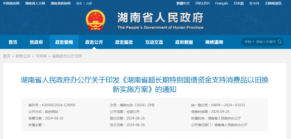 湖南省人民政府办公厅关于印发《湖南省超长期特别国债资金支持消费品以旧换新实施方案》的通知