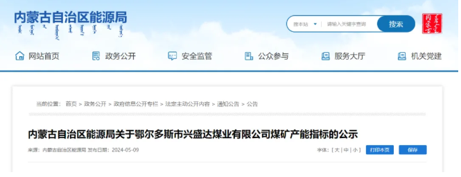 据能源圈了解到,5月9日,内蒙古自治区能源局发布公示指出,鄂尔多斯市兴盛达煤业有限公司煤矿为2024年关闭退出煤矿,生产能力120万吨/年,属于资源枯竭煤矿,不享受中央及自治区奖补资金,产能指标可以自主交易。