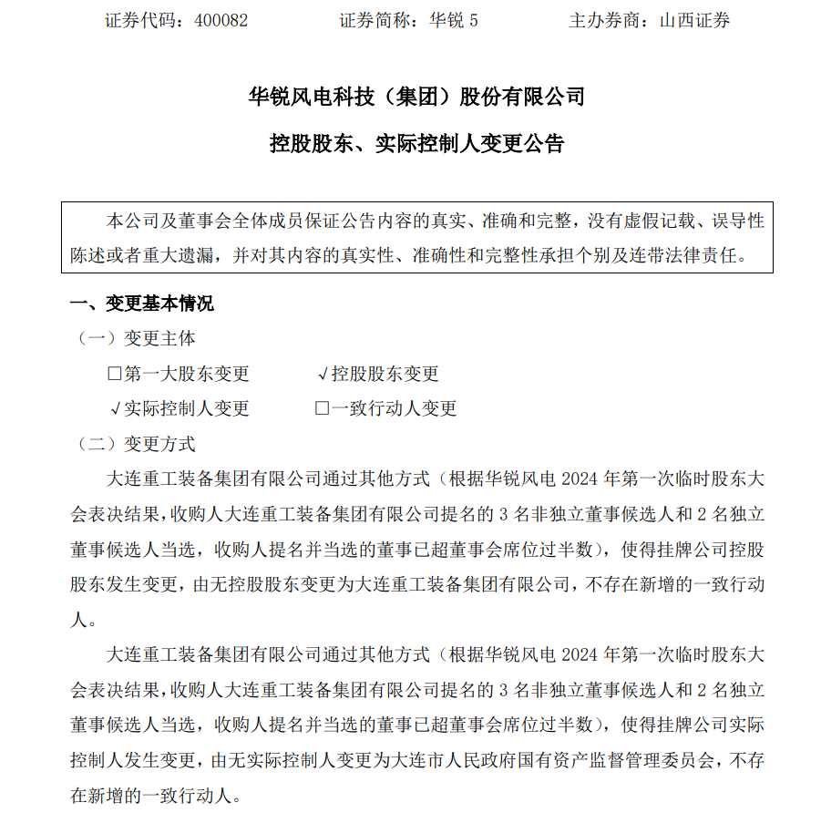 《控股股东、实际控制人变更公告》披露,大连重工装备集团有限公司(以下简称重工装备集团或收购人)通过其他方式(根据华锐风电2024年第一次临时股东大会表决结果,收购人大连重工装备集团有限公司提名的3名非独立董事候选人和2名独立董事候选人当选,收购人提名并当选的董事已超董事会席位过半数),使得挂牌公司控股股东发生变更,由无控股股东变更为大连重工装备集团有限公司,不存在新增的一致行动人。