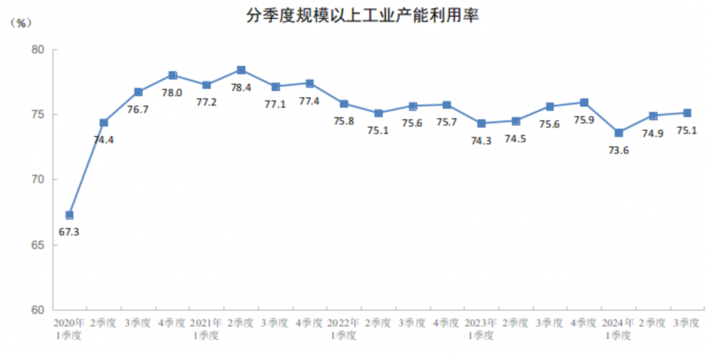 2024年三季度,全国规模以上工业产能利用率为75.1%,比上年同期下降0.5个百分点,比二季度上升0.2个百分点。