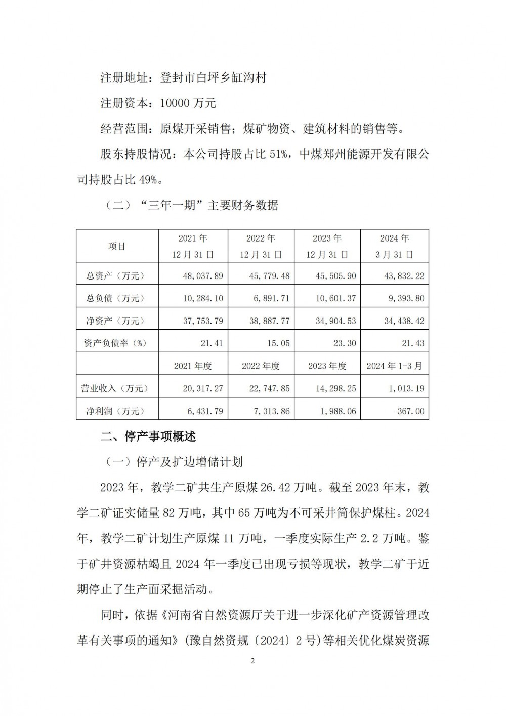 据能源圈了解到,6月21日,郑州煤电发布公告称,2023年,教学二矿共生产原煤26.42万吨。截至2023年末,教学二矿证实储量82万吨,其中65万吨为不可采井筒保护煤柱。2024年,教学二矿计划生产原煤11万吨,一季度实际生产2.2万吨。鉴于矿井资源枯竭且2024年一季度已出现亏损等现状,教学二矿于近期停止了生产面采掘活动。