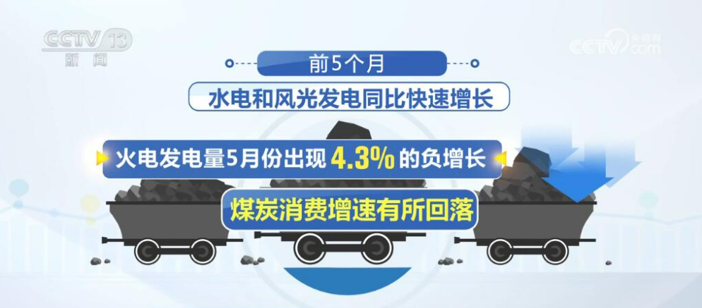 前5个月,水电和风光发电同比快速增长,也让火电发电量在5月份出现了4.3%的负增长,煤炭消费增速有所回落。