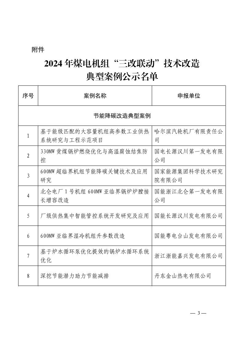 近日发布关于公示2024年煤电机组三改联动技术改造典型案例名单的通知,全文如下: