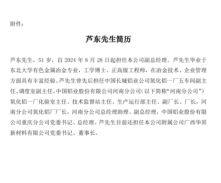 8月28日,中国铝业发布公告称,召开第八届董事会第二十五次会议,审议通过了《关于聘任芦东先生为公司副总经理的议案》。经公司第八届董事会换届提名委员会提名,公司董事会同意聘任芦东先生为公司副总经理,即日生效。