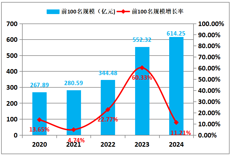 ▲图11 20202024年500强企业中中国企业规模(亿元)及增长率情况