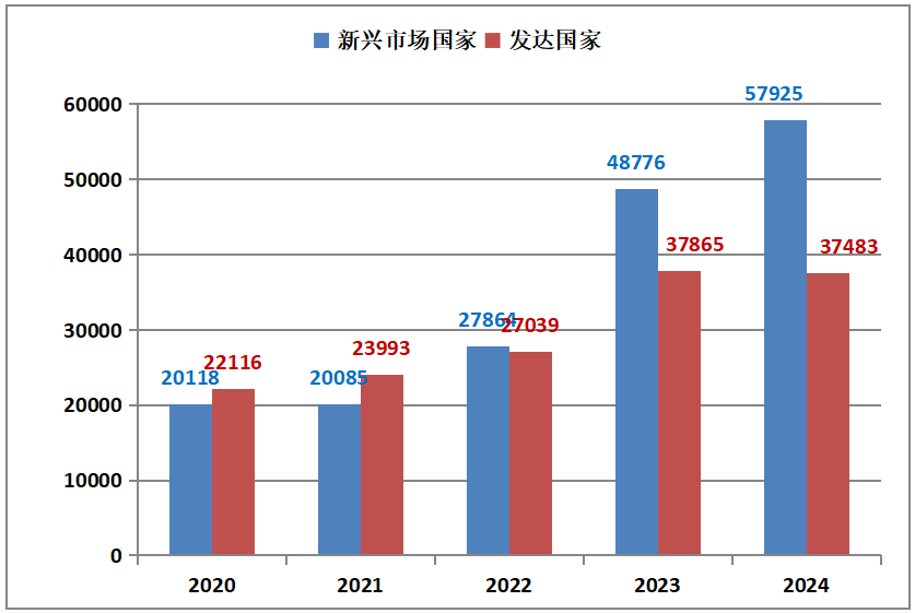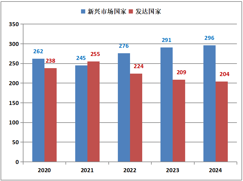 ▲图4 20202024年500强企业中新兴市场国家与发达国家企业总营业收入(亿元)