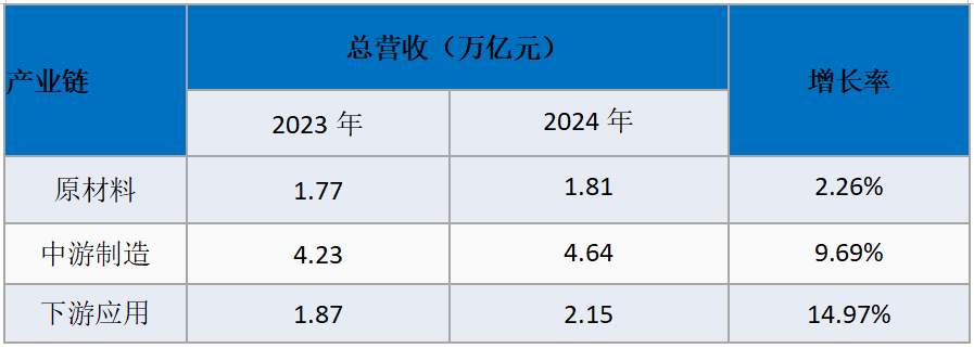 统计结果显示,2024年500强企业中,原材料企业的总营业收入为1.81万亿元,比上年的1.77万亿元增加0.04万亿元,仅增长2.26%;中游制造企业的总营业收入为4.64万亿元,比上年的4.23亿元增加0.41万亿元,增长9.69%;下游应用企业的总营业收入为2.15万亿元,比上年的1.87万亿元增加0.28万亿元,增长14.97%(见表5)。