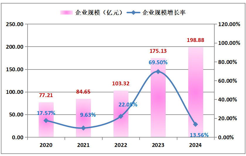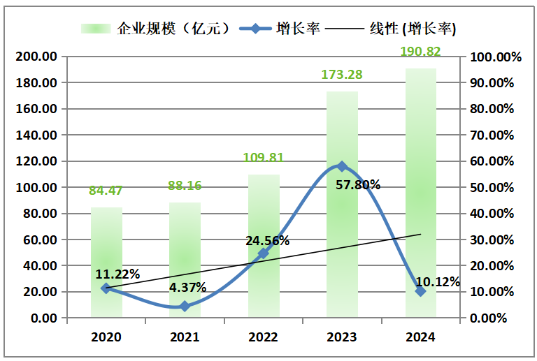 二是企业平均规模增幅大幅降低。统计结果显示,2024年500强企业的平均规模为190.82亿元(见图2),比上年的173.28亿元增加17.54亿元,增长10.12%,增幅比上年度的57.80%大幅减少47.68个百分点。