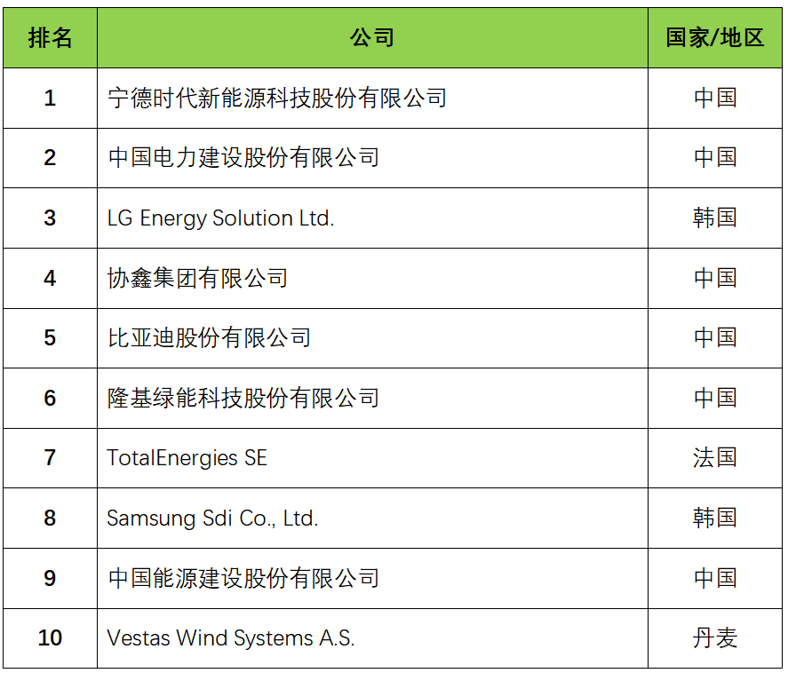 三是前十的企业中,亚洲有宁德时代、中国电建、lg energy solution、协鑫集团、比亚迪、隆基绿能、samsung sdi和中国能建等8家企业,欧洲有totalenergies 和vestas 等2家企业(见表1)。