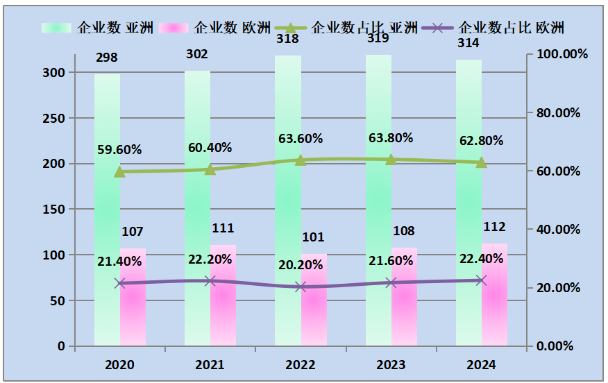 ▲图7 20202024年500强企业中亚洲、欧洲企业数及其占比对比