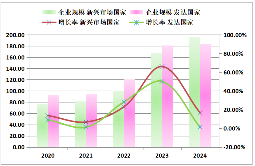 ▲图6 20202024年500强企业中新兴市场国家与发达国家企业规模(亿元)及增长率