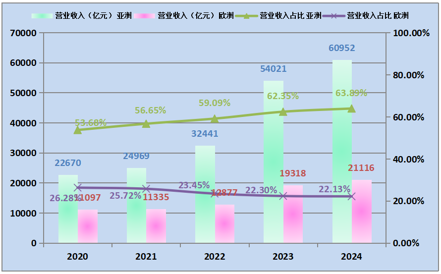 ▲图8 20202024年500强企业中亚洲、欧洲企业营业收入及其占比对比