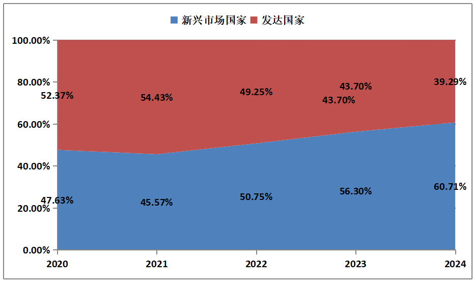 ▲图5 20202024年500强企业中新兴市场国家与发达国家企业营收占比