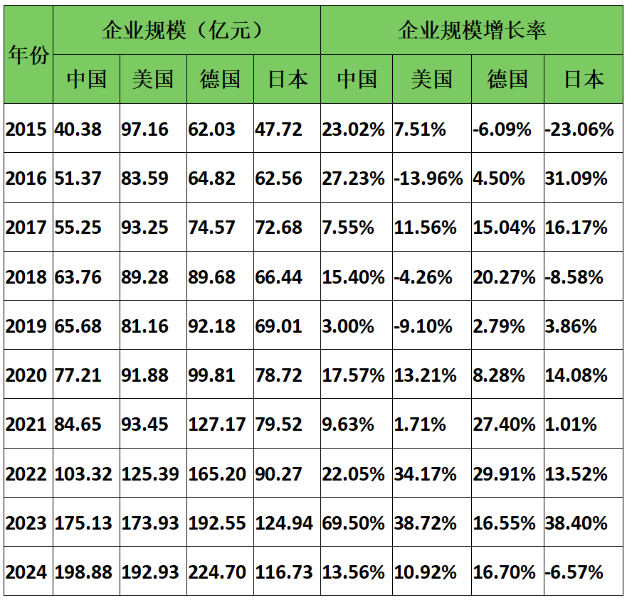 表3 20152024年500强企业中中美德日企业规模及增长情况