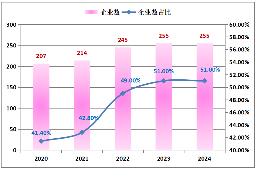 一是企业数上, 2024年500强企业中,中国企业数为255家,与上年持平,占比51%(见图9)。