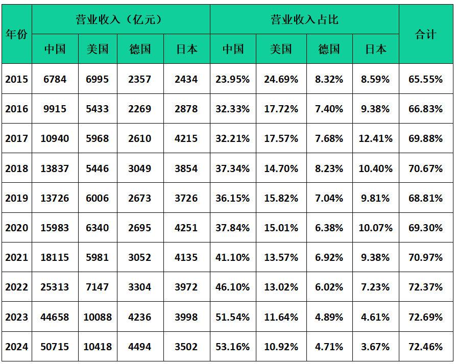 表2 20152024年500强企业中中美德日企业营收占比情况