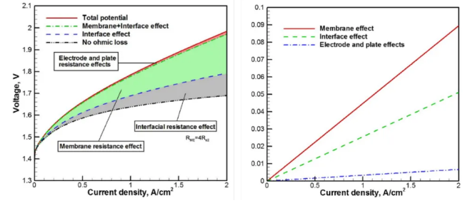 其次是体系电阻,在升高电流密度的情况下,体系内的电阻是更为敏感的因素。一般来说,膜的占比最高,膜电阻>界面接触电阻>电极和金属板本体电阻,膜电阻常常也等同于体系内部的离子传输电阻。pem 电解槽在这一点上与碱性电解槽有很大的不同,暂时不需要考虑电流密度增加造成的气泡墙问题。但也需要警惕气泡过多对水传输的影响,有一些具有梯度的 ptl 设计用于解决这一问题。