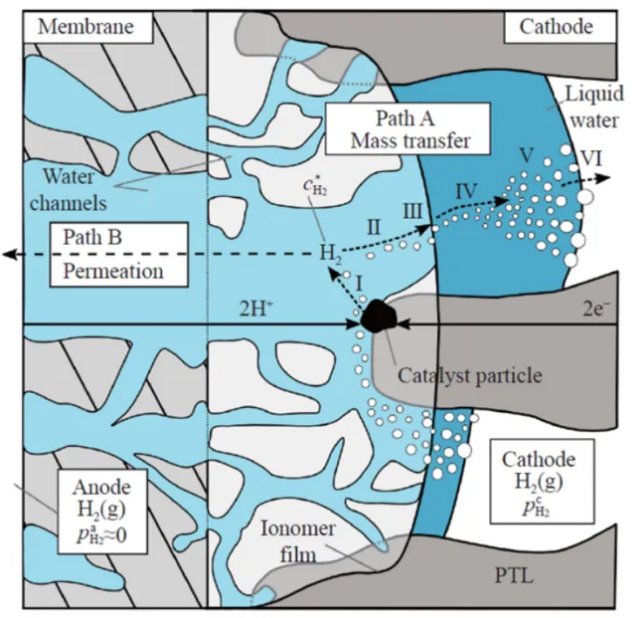 首先,在 ptl 的设计方面,要考虑更为严苛的气液传质情况。高电流密度不仅会带来剧烈的传质,还伴随着散热的增加。不仅要计算反应耗水,还要解决局部过热的问题。高电流密度对 pem 水电解槽的影响在于,由于质子转移,散热主要发生在膜上,而后由于界面中的电子转移,散热发生在催化层上。必须去除产生的多余热量,以在约 90°c 的最高阈值温度下保持常用的 pfsa 基膜的热稳定性。另外,热管理对于防止全氟磺酸(pfsa)聚合物膨胀、催化剂降解以及机械应力可能产生的热梯度至关重要。