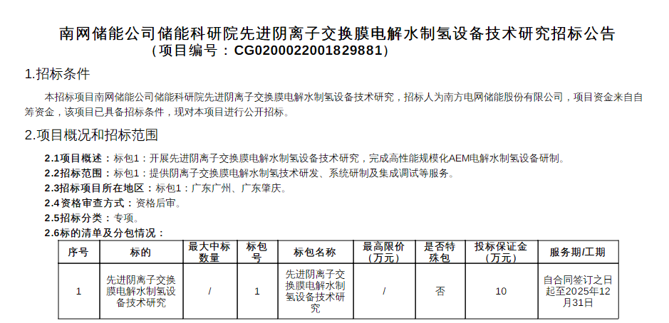 据能源圈了解到,7月19日,南网储能公司储能科研院先进阴离子交换膜电解水制氢设备技术研究招标公告发布,招标人为南方电网储能股份有限公司。