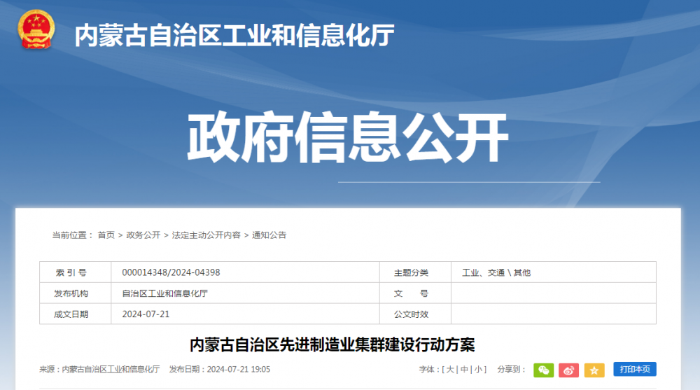 2024年7月21日,内蒙古工信厅k8凯发官网发布《内蒙古自治区先进制造业集群建设行动方案》。明确指出: