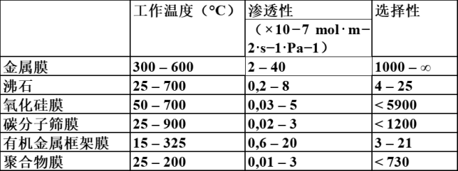 各种氢气提纯膜材料对比表