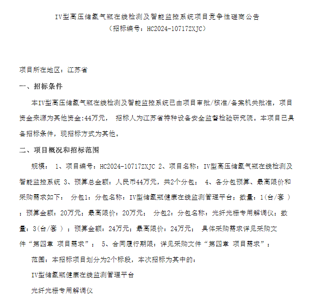 国际氢能网获悉,7月26日,iv型高压储氢气瓶在线检测及智能监控系统项目竞争性磋商公告发布。招标人为江苏省特种设备安全监督检验研究院,预算总金额44万元。共2个分包: