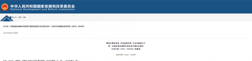 2024年8月8日,国家发展改革委 市场监管总局 生态环境部发布关于进一步强化碳达峰碳中和标准计量体系建设行动方案(2024—2025年)的通知。