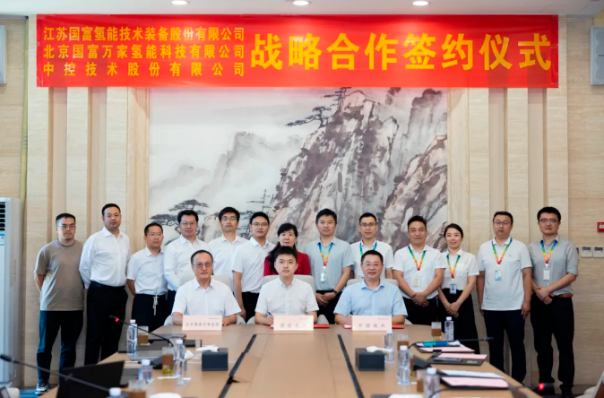 近日,江苏国富氢能技术装备股份有限公司(简称“国富氢能”)、北京国富万家氢能科技有限公司(简称“北京国富万家氢能”)、中控技术股份有限公司(简称“中控技术”)在杭州签署战略合作协议。国富氢能常务副总经理丁镭哲、副总经理兼研究院院长王朝等,北京国富万家氢能董事长卢志勇,中控技术高级副总裁兼首席营销官(cmo)郭飚、风光制氢战团总裁金锋等一同出席了签约仪式。