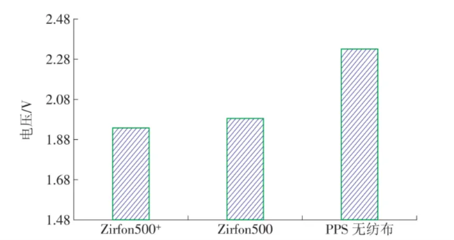 (图:不同隔膜的单电解池的电解水电压(4 ka/m2))
