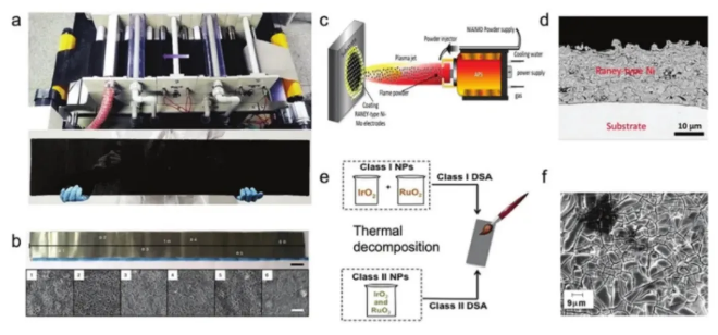 现在大型电解槽中广泛应用的是非贵金属(ni、fe、mo、co等)电极,目前国内大型碱性电解槽使用的电极大多是采用热喷涂工艺制备的雷尼镍电极,一般以镍网为基底,喷涂非贵金属高活性催化剂电极,经过喷涂处理的电极在一定的小室电压下能够展现出较高电流密度,实现了物有所值的电极。