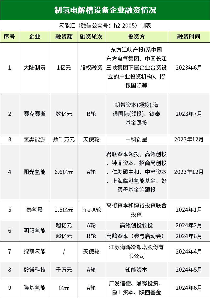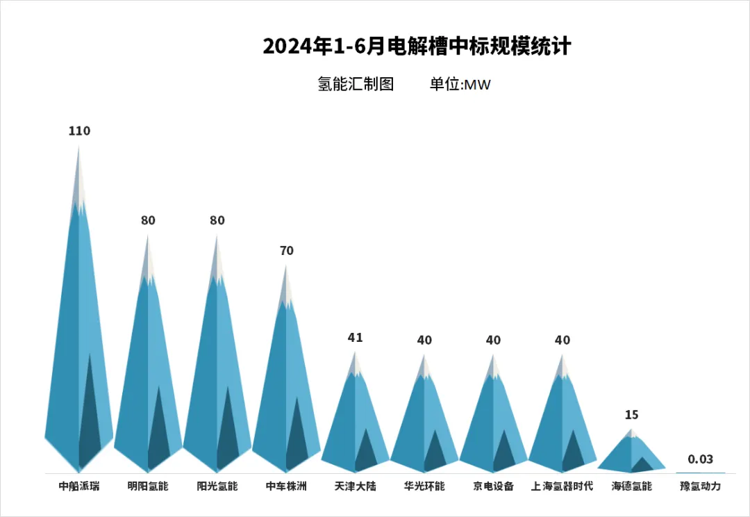 今年1月26日,明阳氢能与泰国ibc lng签署合作协议,联手打造泰国第一个商业绿氢项目。泰国ibc lng将采购明阳氢能的高性能电解槽,并以此为依托构建“光、储、氢”一体化绿氢的“制、储、用”场景。今年2月5日,明阳氢能与江苏常熟虞山高新区签署战略合作协议,根据协议,明阳氢能将在虞山高新区建设面积超过1.6万平米、年产2gw的制氢设备的产业园区。 有了对外合作和对内生产布局,明阳氢能顺利完成了a轮融资计划。本轮融资由公司创始股东高瓴创投(gl ventures)领投,融资规模超亿元。首轮融资之后,明阳氢能的发展速度非常迅猛。氢能汇(微信公众号:h2-2005)据公开资料统计,2024年上半年国内有7个电解槽订单公示,总中标量规模高达516.03mw。2024上半年有4个大标方电解槽订单分别为320mw、80mw、70mw、45mw,合计515mw,且这4笔订单都集中在5月和6月确认中标信息。在以上中标企业排名中,明阳氢能排名第二。