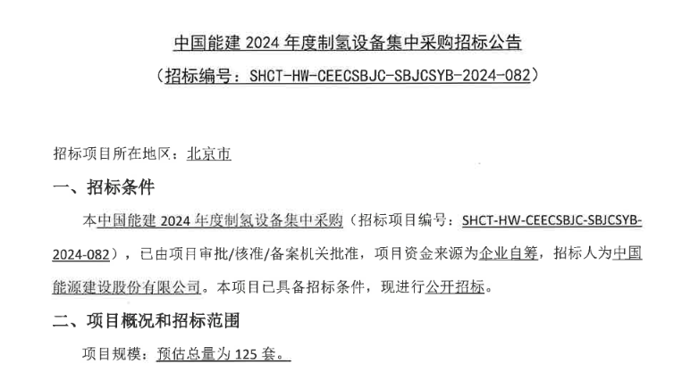 8月29日,中国能建发布2024年度制氢设备集中采购项目招标公告,本次招标为2025年1月至2025年12月股份公司所属企业投资或承建项目所需制氢设备采购,预估总量为125套。