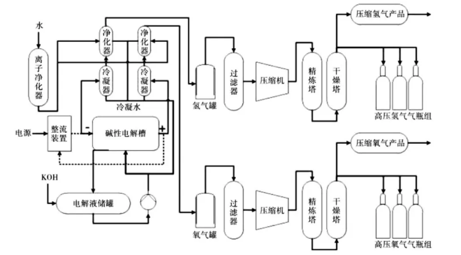 [图来源:瞿丽莉《质子交换膜电解水制氢技术在电厂的应用》碱性电解水系统流程图]