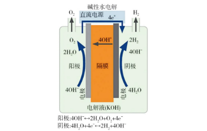 [来源:瞿丽莉《质子交换膜电解水制氢技术在电厂的应用》碱性电解水制氢结构原理图]
