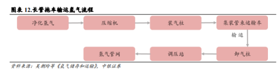 · 长管拖车:是由大容积钢制无缝气瓶与走行装置固定而组成的高压氢气运输设备,其储氢空间一般由多个压力为20mpa、长约10m的高压储氢钢瓶组成。储氢钢瓶数量通常为9个,可充装约3500nm3氢气。