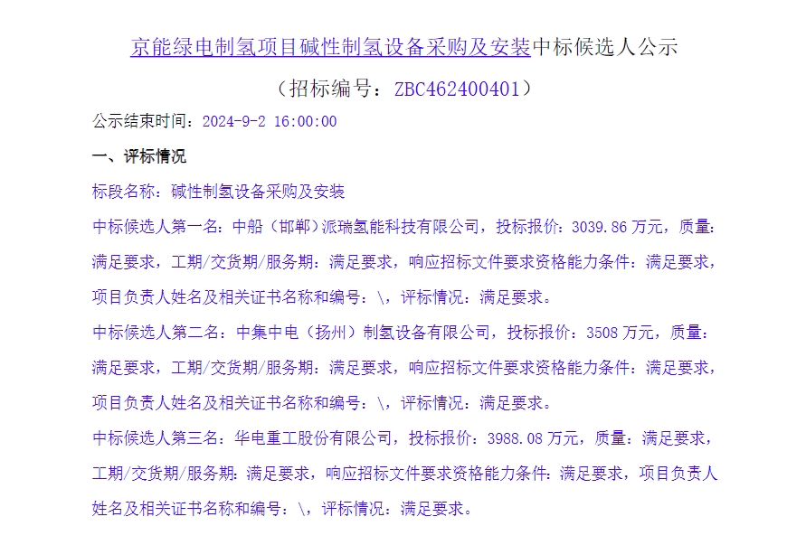 8月29日,京能绿电制氢项目碱性制氢设备采购及安装中标候选人公示: