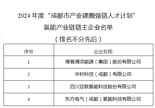 其中明确提到:2024年度“成都市产业建圈强链人才计划”氢能产业链链主企业评选名单共有四个企业,分别为:厚普清洁能源(集团)股份有限公司、中材科技(成都)有限公司、四川亚联氢能科技股份有限公司、东方电气(成都)氢能科技有限公司。