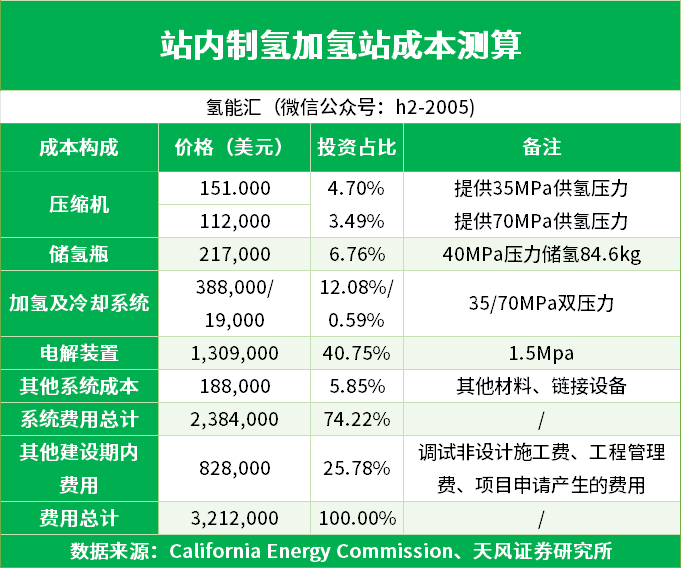 站内制氢加氢站作为一种常见的加氢站形式,其建设成本受到多种因素的影响。其成本计算包括建设费用、制氢设备(电解装置)、氢气纯化、压缩设备(压缩机)、储氢设备(储氢瓶)和加氢设备(加氢及冷却系统)等几大方面的成本支出,具体成本构成如下表: