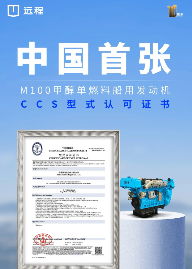近日,远程新能源商用车获得中国船级社颁发的中国首张m100甲醇单燃料船用发动机型式认可证书。这标志着远程醇氢电动系统在船舶领域获得行业权威认可,助力绿色航运加速实现新跨越。