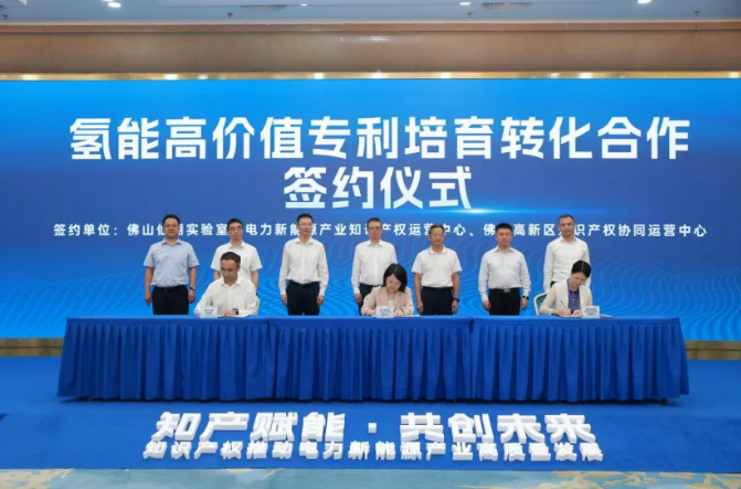 活动上,在国家知识产权局知识产权运用促进司副司长彭文,中国南方电网有限责任公司科技创新部副总经理王斐,广东省市场监督管理局(知识产权局)党组成员、广东省知识产权保护中心党委书记、主任高国盛,南方电网科学研究院有限责任公司党委副书记、院长蔡希鹏,国家知识产权局知识产权检索咨询中心党委书记、主任刘毅,国家知识产权局专利局专利审查协作广东中心党委书记、主任王智勇,广州市市场监督管理局(知识产权局)党组成员、副局长万众等领导嘉宾见证下,佛山高新区知识产权协同运营中心与佛山仙湖实验室与、电力新能源产业知识产权运营中心进行了氢能高价值专利培育转化合作签约仪式。标志着通过氢能高价值专利培育转化合作,各单位将助力氢能产业技术创新和产业升级。
