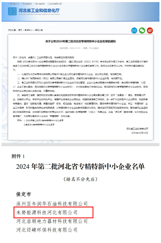 近日,河北省工业和信息化厅发布了《关于公布2024年第二批河北省专精特新中小企业名单的通知》,未势能源科技河北有限公司【以下简称:未势能源(河北)】成功通过2024年度河北省“专精特新中小企业”认定。