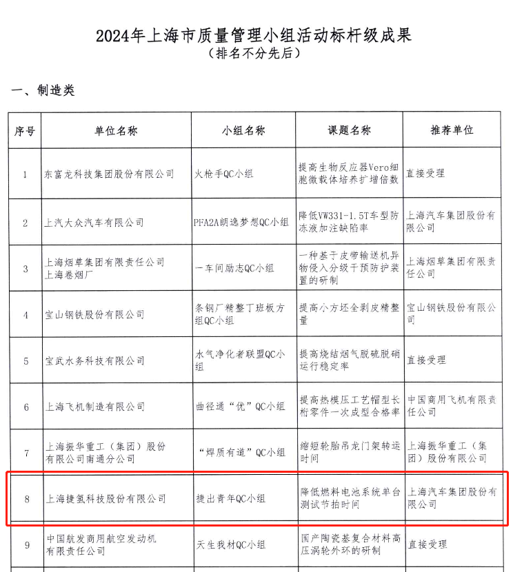 “2024年上海市质量管理小组活动成果”由上海市质量工作领导小组办公室(上海市市场监督管理局)、上海市总工会、共青团上海市委员会、上海市妇女联合会、上海市质量协会联合审定,遴选出27项标杆级成果,113项优秀成果。捷氢科技qc课题《降低燃料电池系统单台测试节拍时间》荣获标杆级成果。