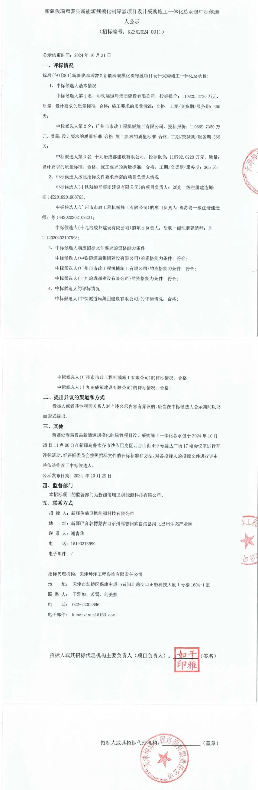 10月29日,新疆俊瑞焉耆县新能源规模化制绿氢项目设计采购施工一体化总承包中标候选人公示。
