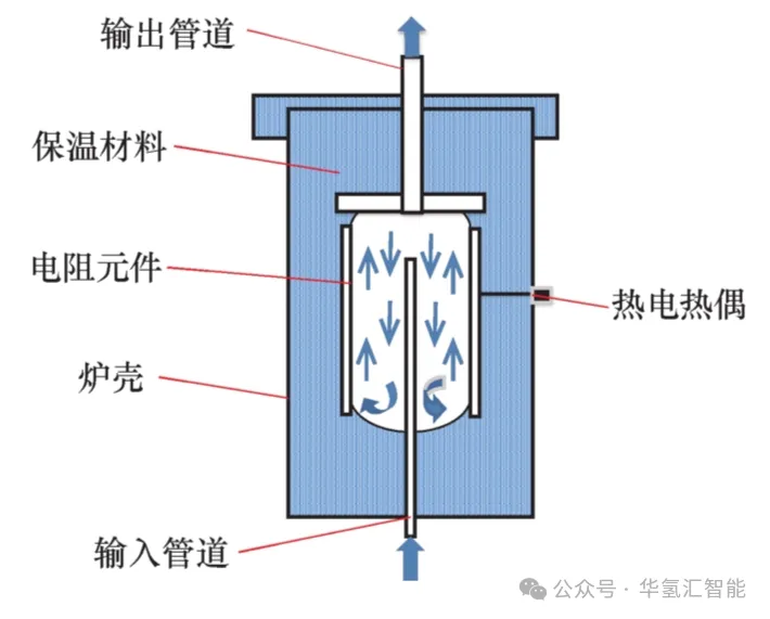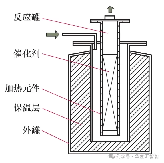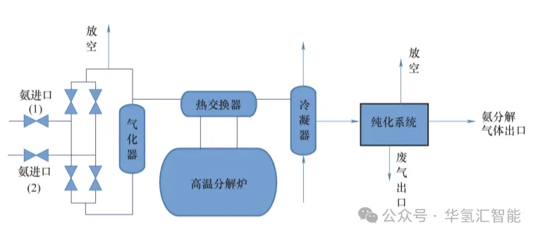 氨分解的工艺设备包括:高温分解炉、冷凝器、换热器高温分解炉:氨分解制氢中的关键设备是高温分解炉。目前装置产气压力低于0.1mpa,与待净化气体压力不匹配,导致除氧效果不稳定。承压式分解反应器由反应罐、电热元件、保温层和外罐组成,反应罐内外壁通道相通,外壁绕电热元件,内装镍基催化剂。氨气先被电热元件加热,再进入装催化剂的反应罐分解。由于流通阻力小,内外压几乎相等,罐壁压力相互抵消,使反应罐无压力工作。氨分解炉分为外热式和内热式两种。内热式氨分解炉中,氨气通过喷孔喷出并被加热分解。氨气与催化剂接触后迅速分解,生成氢气和氮气混合气体流出。内热式相比外热式分解炉,残液少且节省约25%电量。