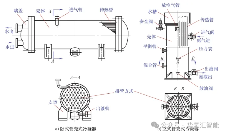冷凝器冷凝器的作用是将高压过热制冷剂蒸气冷却成液体。主要有两种类型:1. 水冷却式冷凝器:利用水带走制冷剂的热量,可一次性使用或循环使用。制冷剂在管外,冷却水在管内流动,逆向流动以增强热交换。