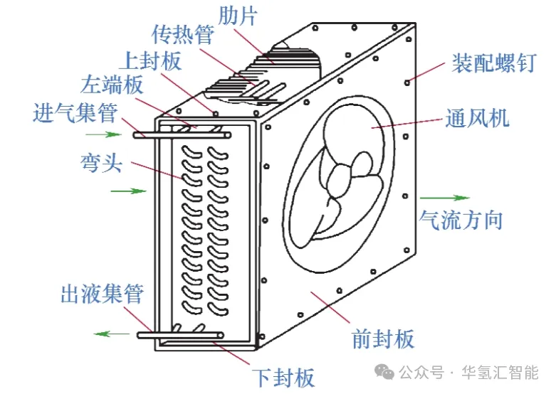 空气冷却式冷凝器:通过空气带走制冷剂的热量。空气在管外流动,制冷剂在管内冷凝,管外通常设有肋片以增强热交换。